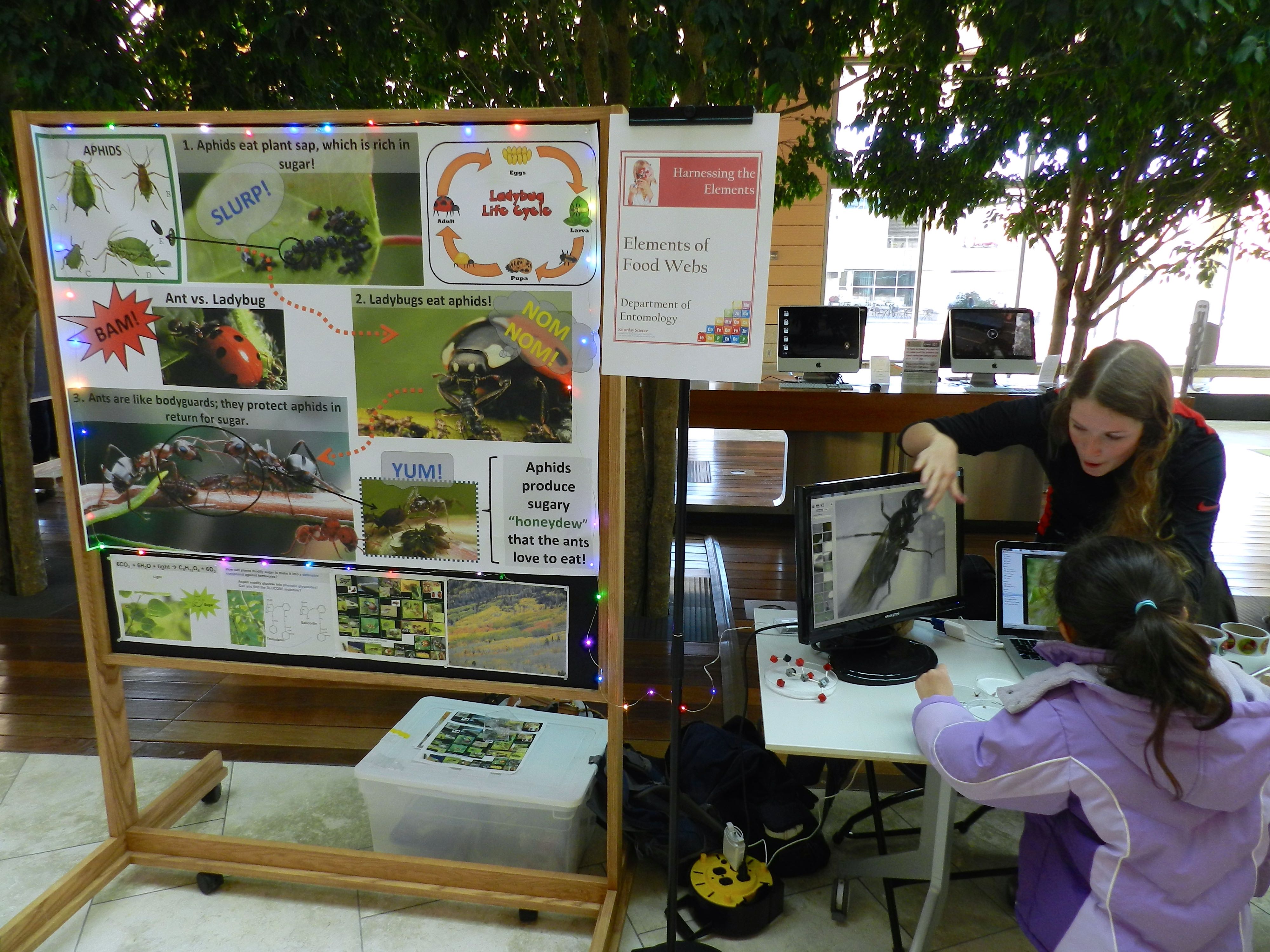 To illustrate food webs to kids and their families, we brought in some live specimens of aspen trees, aphids, ladybugs, and ants. Aphids eat sap from aspen, which is rich in sugar, and ladybugs are predators of aphids. Luckily, some aphids have ant bodyguards for protection. Ants feed on “honeydew”, a sugary substance that aphids secrete. In turn, ants protect aphids from predators.